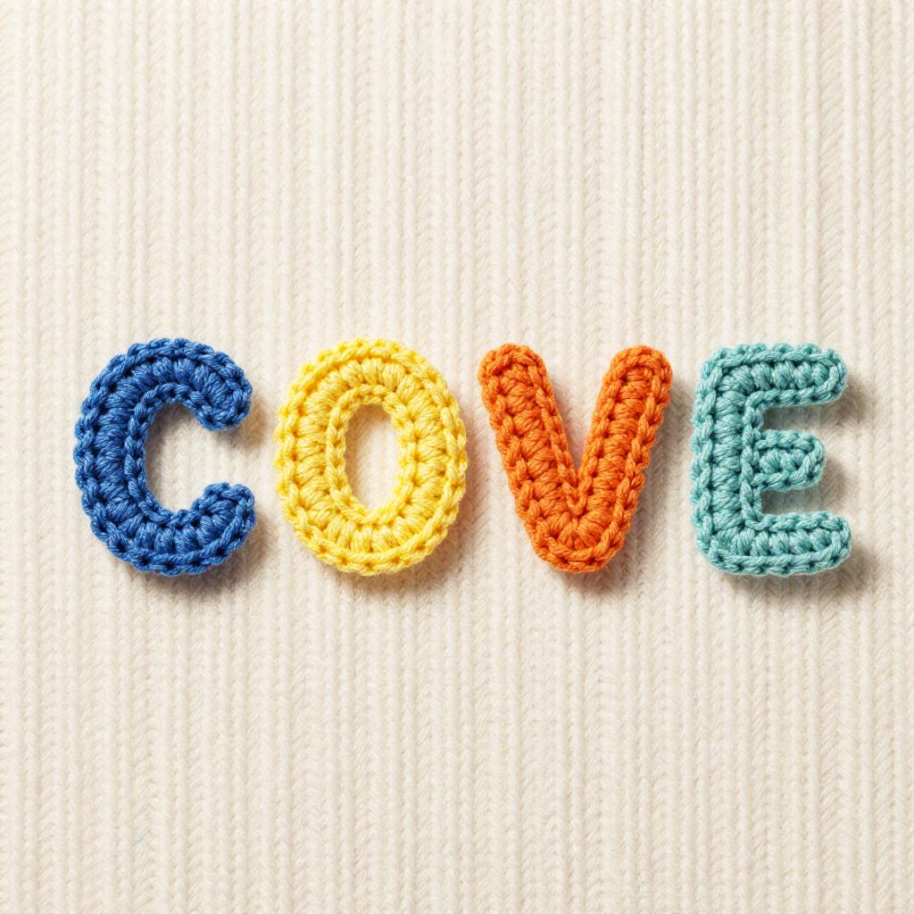 A photograph of the word "COVE" crafted in colorful crochet. Each letter is individually made from textured yarn, with "C" in blue, "O" in yellow, "V" in orange, and "E" in teal. The letters are arranged horizontally against a white, textured background, casting soft shadows to the right. The yarn's stitch pattern is visible, adding a tactile, handmade feel to the image. The bright, contrasting colors and crochet texture create a vibrant, cheerful effect.