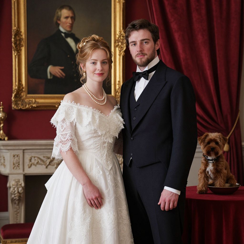 Formal portrait featuring a couple dressed in Victorian-era attire, with the woman in a white off-the-shoulder gown adorned with lace and pearls, and the man in a dark suit with a bow tie, set against a backdrop of red curtains, a golden-framed portrait of a man gesturing, and a small brown dog perched on a red table with a bowl nearby.