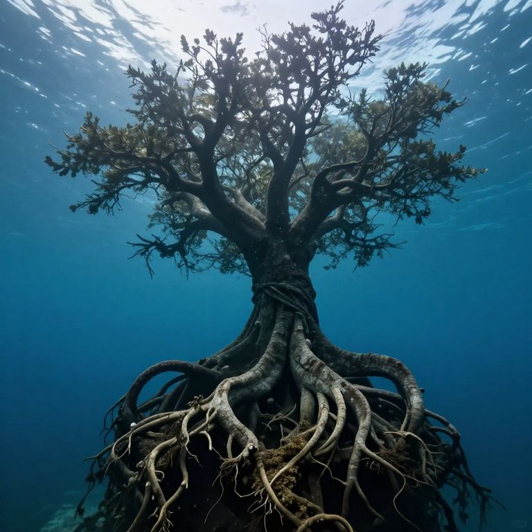Emerging from the depths of the ocean, an ancient tree stands as a symbol of resilience and hope, its roots entwined with the currents below and its branches reaching toward the sky above, embodying the eternal struggle between rootedness and transcendence.