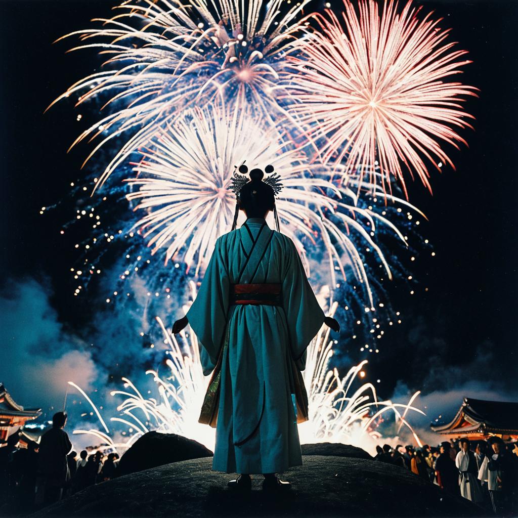 Takashi Taniguchi, Night Deity in Ethereal Robes performs amidst a backdrop of vibrant fireworks, creating a stunning visual narrative in Mount Osore.