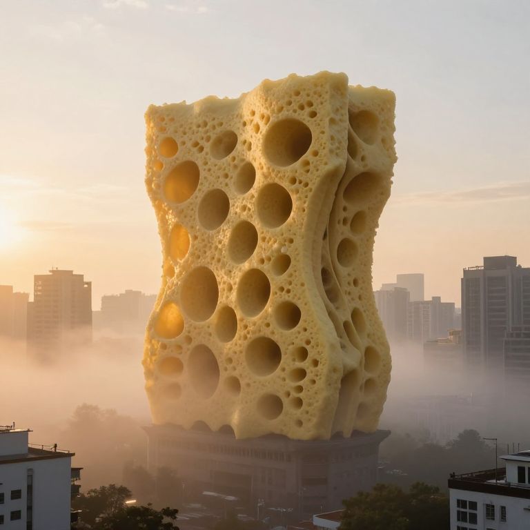 Photograph of a surreal, giant, yellow, sponge-like structure with numerous circular holes, resembling a giant slice of Swiss cheese. It towers over a cityscape at sunrise, with sunlight casting a golden glow on its porous surface. The background features a misty horizon with tall buildings, and the foreground shows smaller buildings and trees. The texture of the structure is rough and porous, contrasting with the smooth, modern architecture of the city. The image blends urban and surreal elements, creating an otherworldly scene.