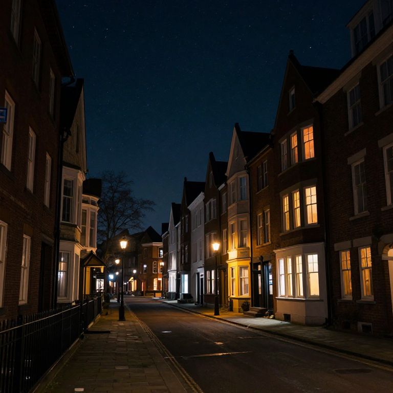 Photograph of a quiet, narrow, and dimly lit street at night in a quaint, European-style town. The street is flanked by tall, brick buildings with gabled roofs, some with warm, yellow-lit windows. Street lamps cast a soft, golden glow, illuminating the cobblestone sidewalks. The sky is dark blue with scattered stars visible. The buildings have a mix of white and dark brown facades, and some windows reflect the street lights. The atmosphere is calm and serene, with no people in sight. The perspective leads the eye down the street, creating a sense of depth and tranquility.