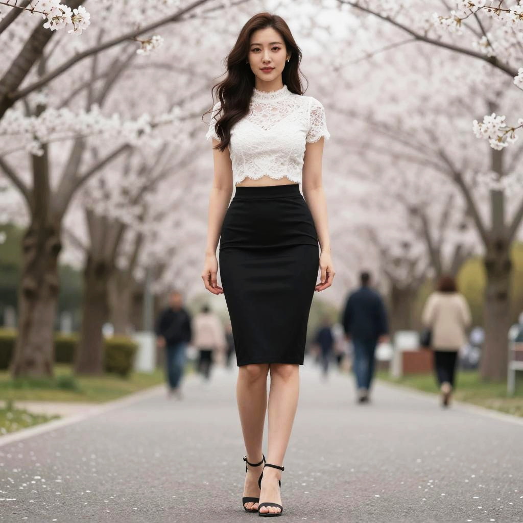 A Pear-shaped body type woman, in a contemporary casual style with a cropped black tank top and a light grey high-waisted mini skirt, stands in a botanical garden under the cherry blossoms, embodying the vibrant visual style of Shueisha. She has bare arms and wears a turquoise ring on her right hand. Sexy. Pretty face and beutiful eyes