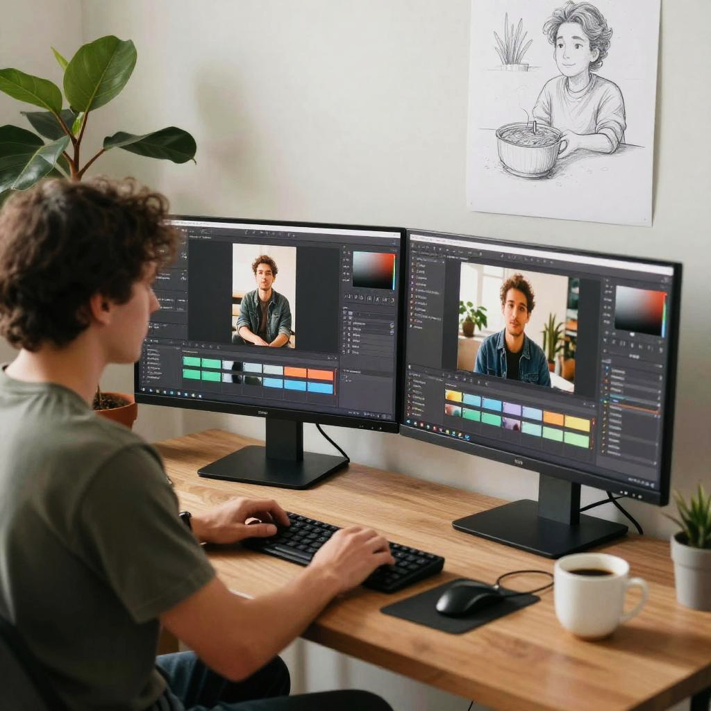 Creative workspace showing recadrer workflow, multiple monitors with photo editing software open, designer focusing on cropping images, cozy studio environment with plants and coffee cup, realistic digital drawing, muted colors