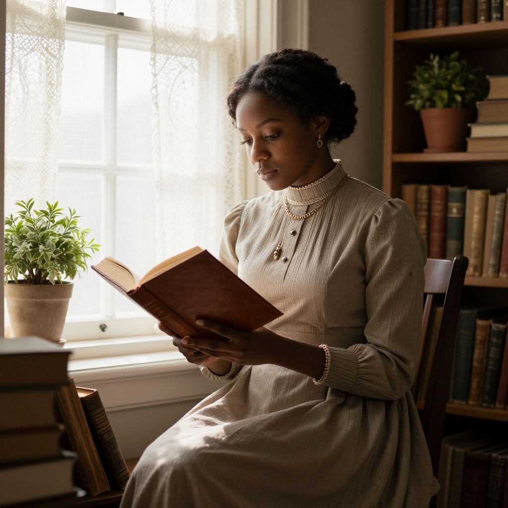 Victorian black woman reading a leather-bound book by a large window, wearing a modest, high-collared dress with subtle jewelry, surrounded by shelves of old books and potted plants, sunlight filtering through lace curtains, evoking calm and intellect.
