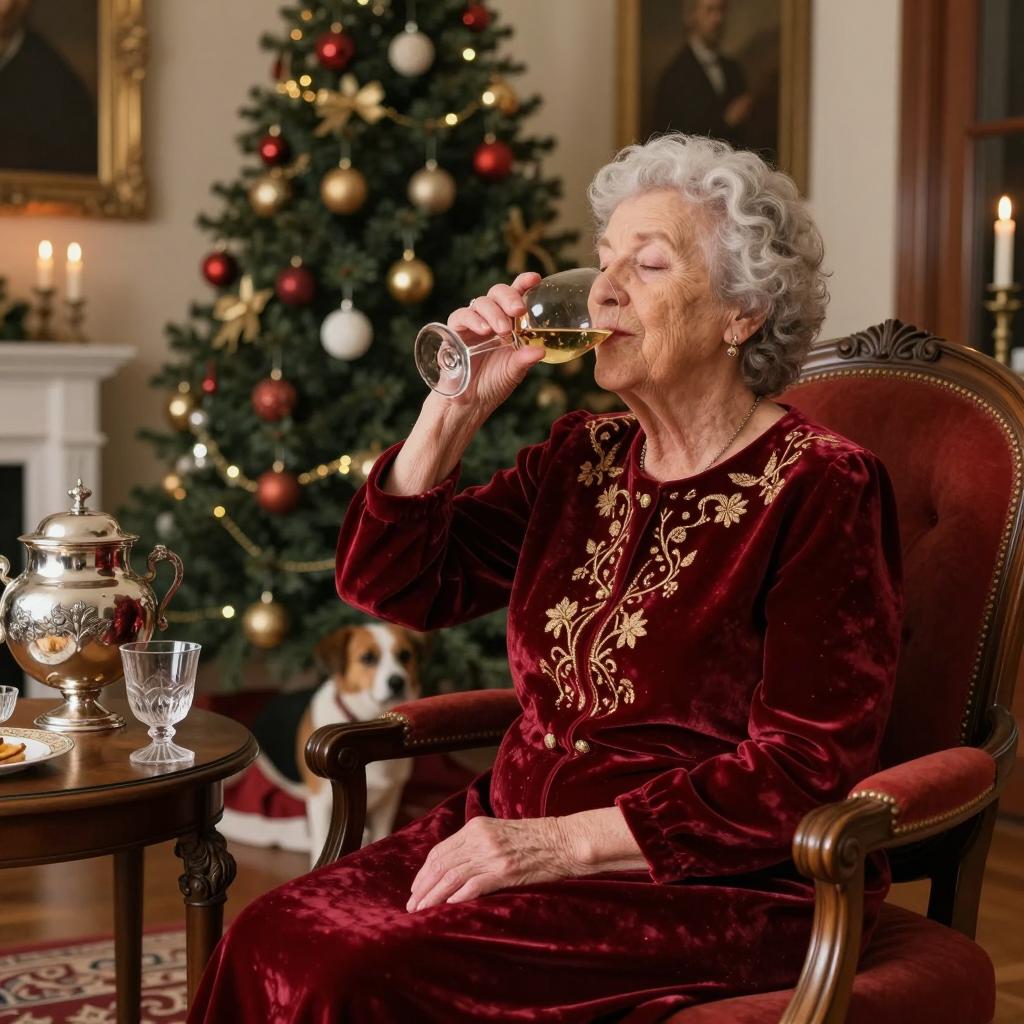 Elderly woman in a rich red dress with gold embroidery, wearing a brown fur stole, stands near a decorated Christmas tree with white and red lights. Background has a wooden fireplace, green curtains, framed pictures, and a candleholder with white candles on a table. Ornate wall tapestry, framed painting, and red poinsettia flower on table. Woman's expression is focused. Three people. Warm, festive indoor setting. Photographic image.