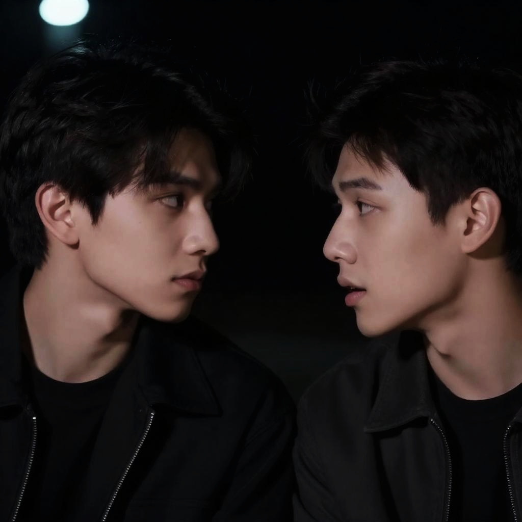 Photograph of two young men with dark hair in a dimly lit setting. The man on the left has a serious expression, looking intently at the man on the right, who is leaning slightly forward with a slightly open mouth. Both wear dark jackets. The background is mostly black with a subtle light source.