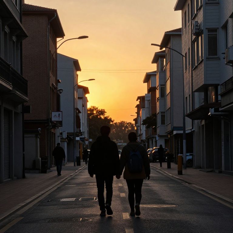 Sunset bathes a quiet urban street in warm hues as two figures walk hand-in-hand toward the golden glow, flanked by multi-story buildings and punctuated by distant silhouettes of pedestrians and streetlights.