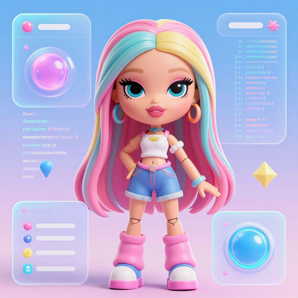 Stylized bratz doll AI generator interface design featuring cartoonish digital avatars, bright pastel colors, large expressive eyes, playful poses, surrounded by holographic UI elements and AI code patterns, with a whimsical and fun atmosphere.