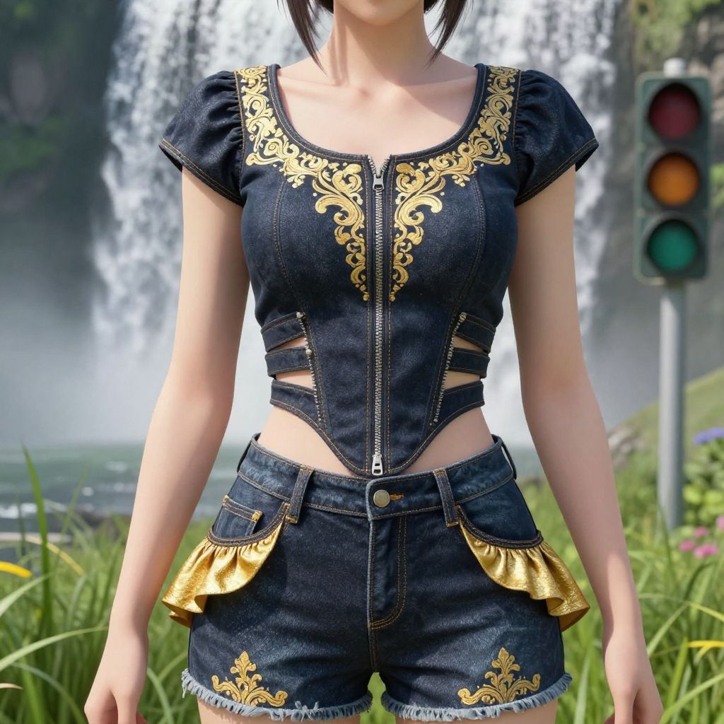 Photorealistic digital artwork of a young woman from the waist up, wearing a black denim top with gold floral embroidery, short sleeves, and a zipper down the center. She pairs this with black denim shorts featuring gold accents on the pockets and hem. Her dark brown hair is partially visible. The background showcases a blurred waterfall with mist, green grass, and a traffic light to the right. The image emphasizes the contrast between the dark denim and vibrant gold embroidery.