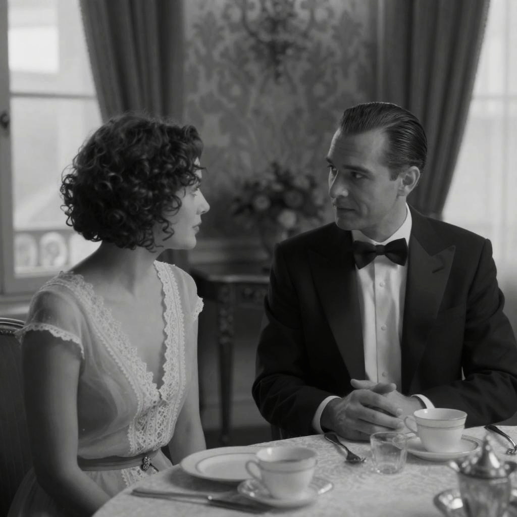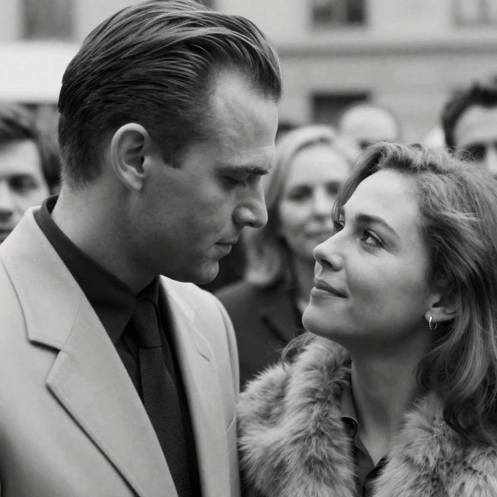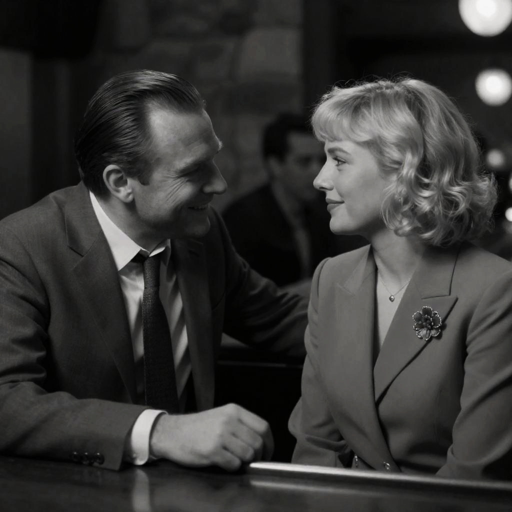 Black and white photograph of a man and woman in a bar. Man with slicked-back hair, wearing a suit, leans forward, smiling at the woman. Woman with short, wavy blonde hair, wearing a jacket with a flower pin, looks at him with a gentle smile. Background includes a stone wall, another person in the distance, and dim lighting. Both seated close together, interacting intimately.