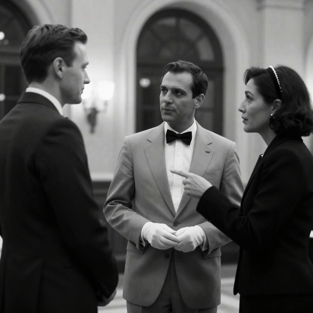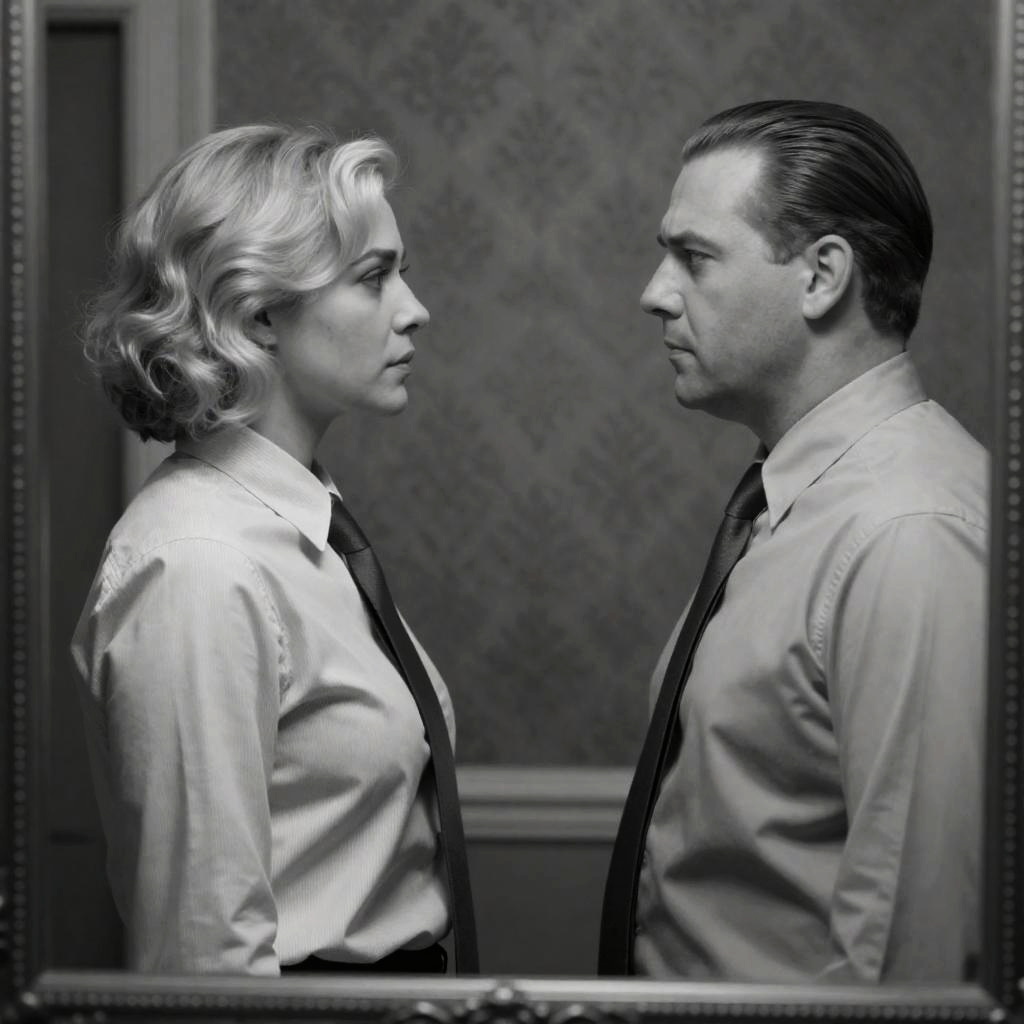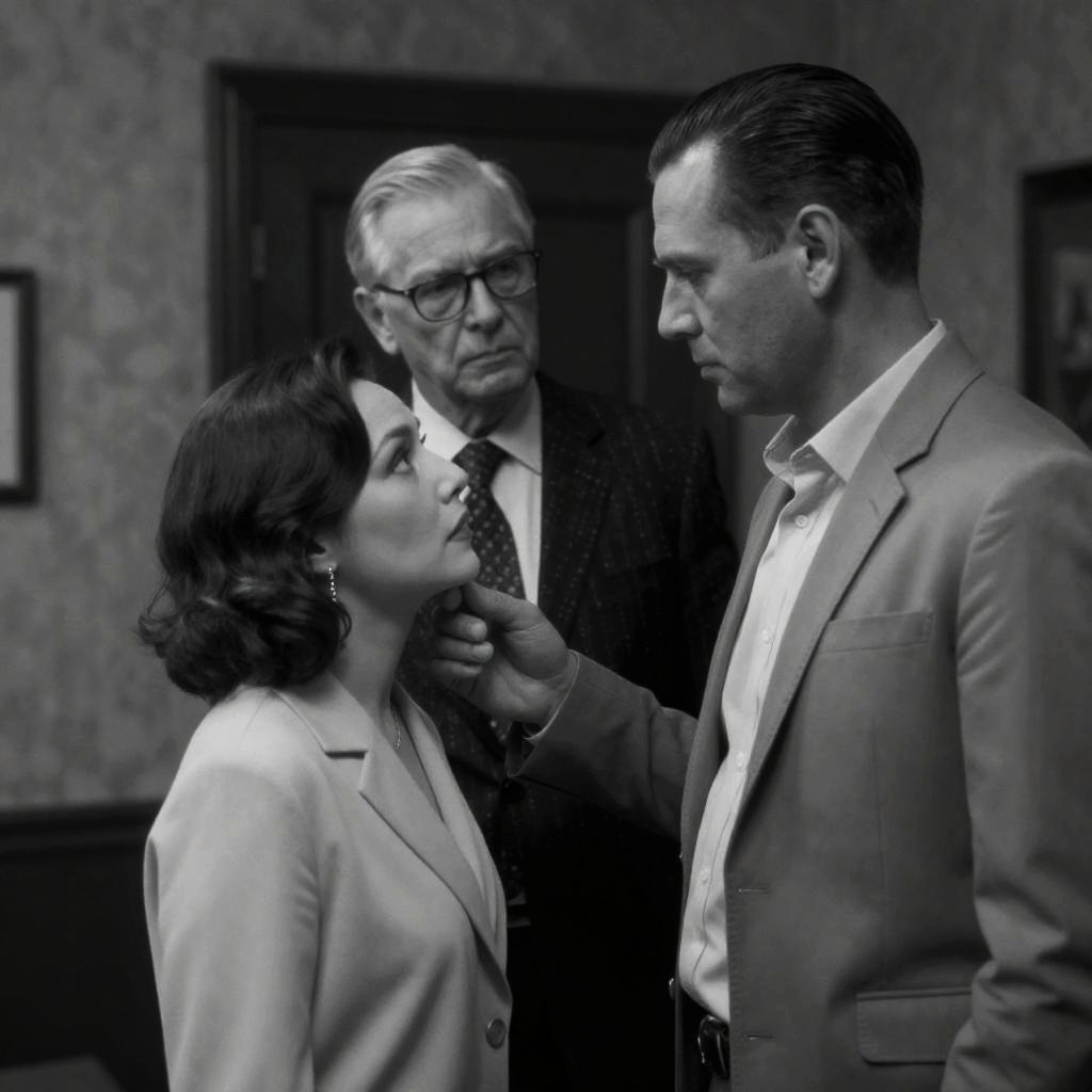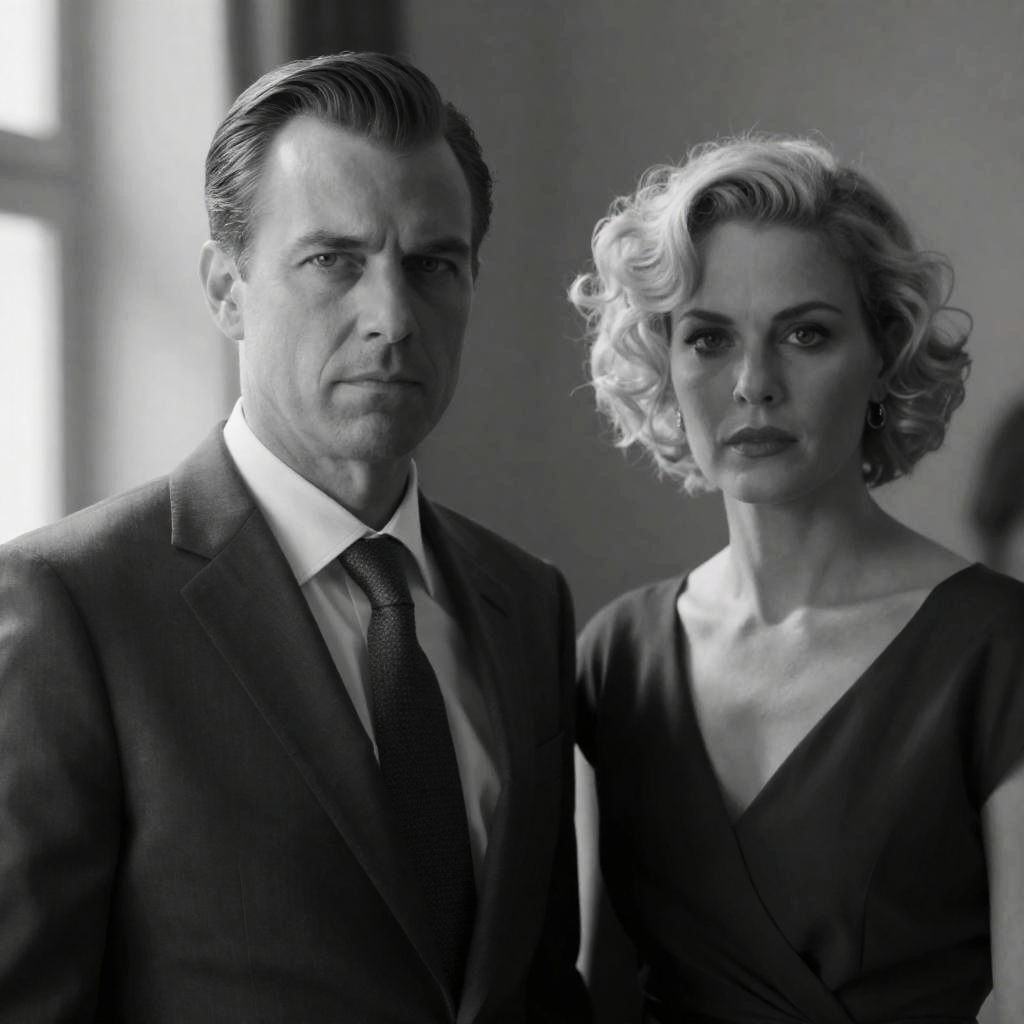 Black and white photograph of a man and woman in a bar. Man with slicked-back hair, wearing a suit, leans forward, smiling at the woman. Woman with short, wavy blonde hair, wearing a jacket with a flower pin, looks at him with a gentle smile. Background includes a stone wall, another person in the distance, and dim lighting. Both seated close together, interacting intimately.