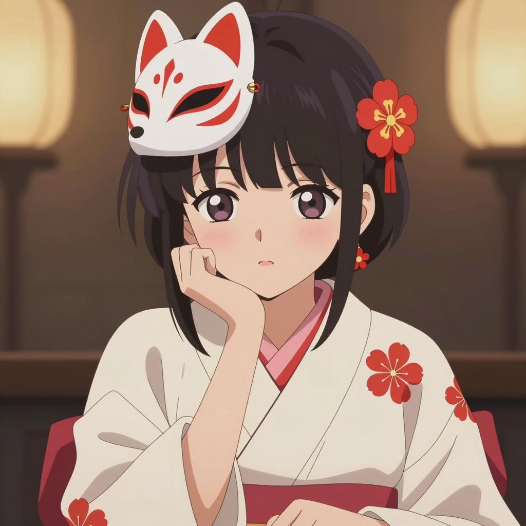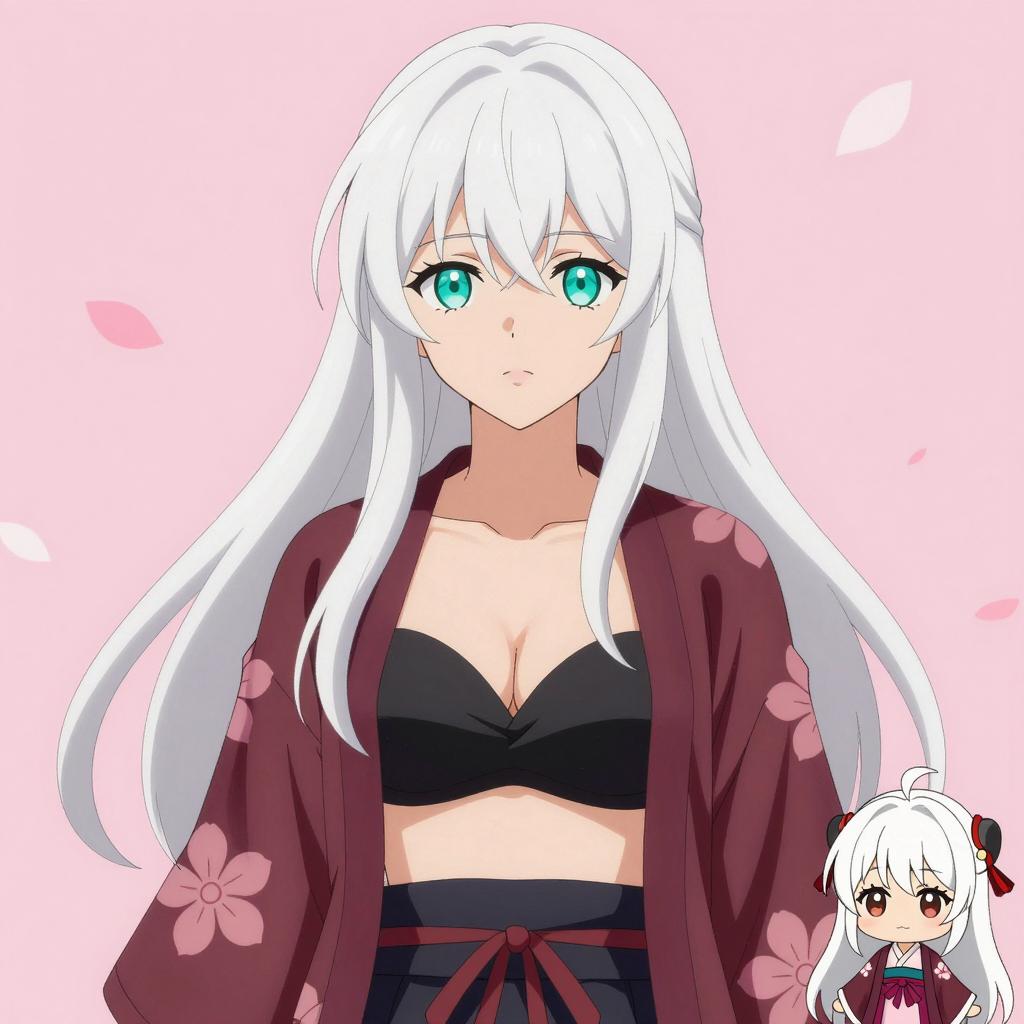 Anime-style illustration of a young woman with long black hair and striking purple eyes standing on a balcony surrounded by lush green plants. She is wearing a fitted purple floral dress with thin straps, a deep neckline, and a sash tied at the waist. The background shows urban high-rise buildings, indicating a city environment.