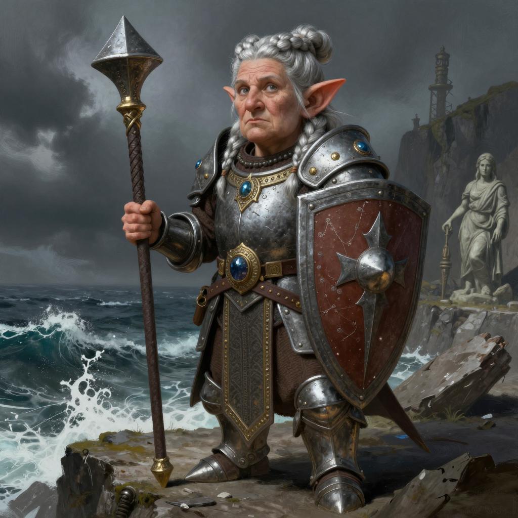Female dwarf, full-body fantasy illustration of regal dwarven queen-warrior with intricate gold circlet and calm expression, clad in lightweight mail-and-leather mix with throwing axes and small buckler, standing in stormy cliffside overlooking a roaring sea and broken statues, calm, balanced studio-style lighting that emphasizes details and color, high-detail painterly concept art, dynamic composition, ultra-detailed