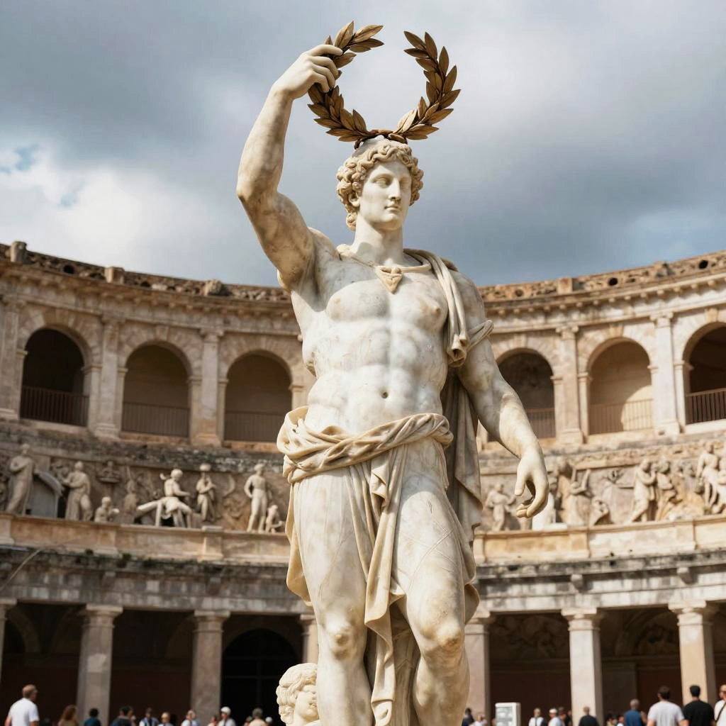 Jacked Greek statue holding a laurel wreath above its head, symbolizing victory, highly detailed marble texture showing veins and muscle fibers, set in a Roman amphitheater with spectators carved on walls, dramatic cloudy sky for a mythic atmosphere.