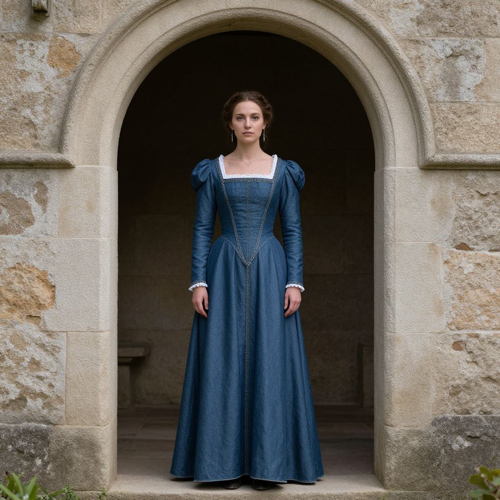A photograph of a young woman with fair skin and dark brown hair, standing in a stone archway. She wears a long, dark blue, Victorian-style dress with puffed sleeves and a white square neckline, adorned with intricate stitching. Her expression is serious, and she gazes directly at the camera. The stone archway has a textured, weathered appearance, and the background is dimly lit. The dress contrasts with the gray stone, highlighting her figure. The setting suggests an old, possibly historical, building.