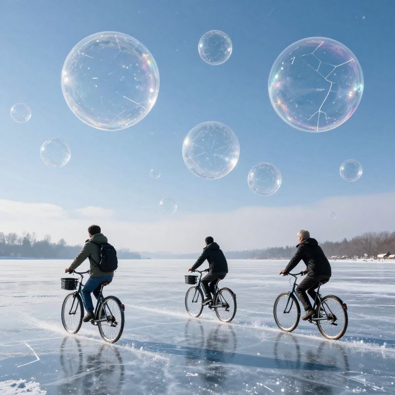 Three cyclists on a frozen lake, silhouetted against a bright blue sky with large, transparent soap bubbles floating above.