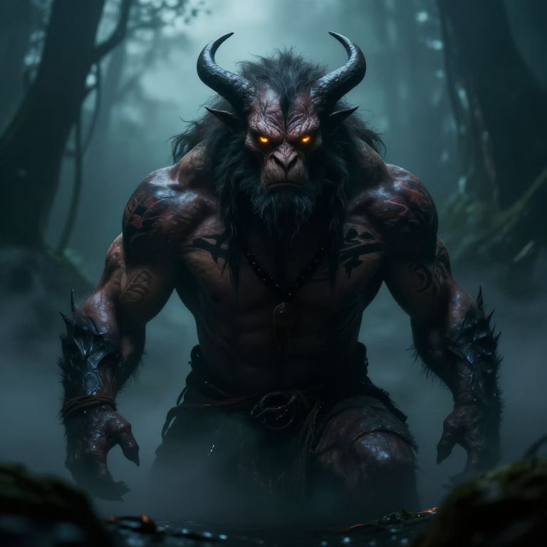 Digital art of a muscular, demonic creature with glowing orange eyes, black horns, and dark fur, standing menacingly in a foggy forest.