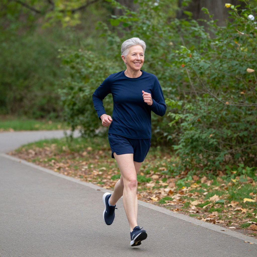 Energetic senior woman jogging outdoors in a serene park setting, wearing a navy-blue long-sleeve shirt and matching shorts, with a joyful smile as she moves along a paved path surrounded by lush greenery and scattered autumn leaves.