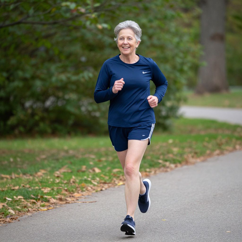 Photograph of a smiling older woman with short white hair, wearing a black long-sleeve shirt and black shorts, jogging on a tree-lined path