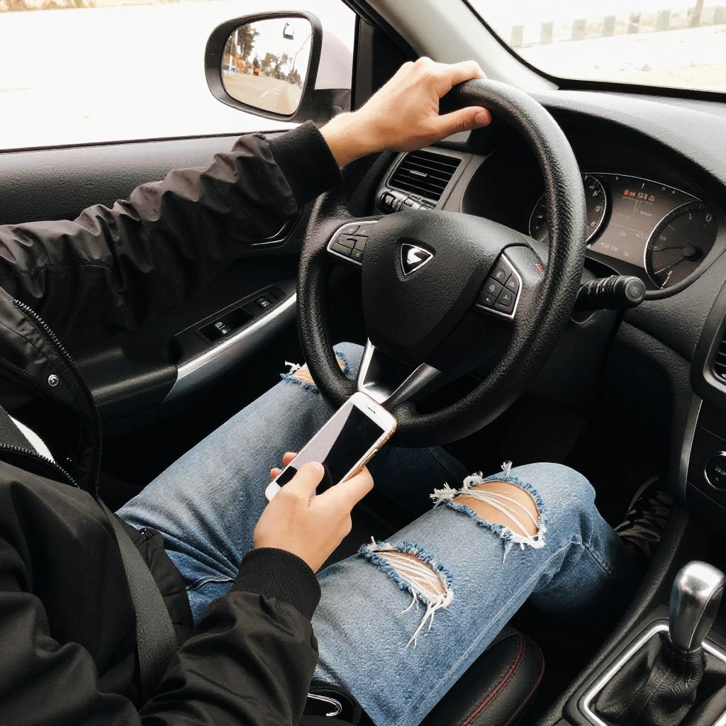 Photograph of a person sitting in a dark-colored car, holding a smartphone in their left hand and resting their right hand on the steering wheel. They're wearing a black jacket and ripped jeans, with black sneakers. The car's interior features a black steering wheel with a logo in the center, a dark dashboard, and a gear shift on the right. The image has a slightly grainy, high-contrast look.
