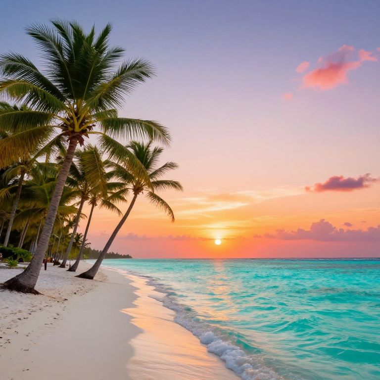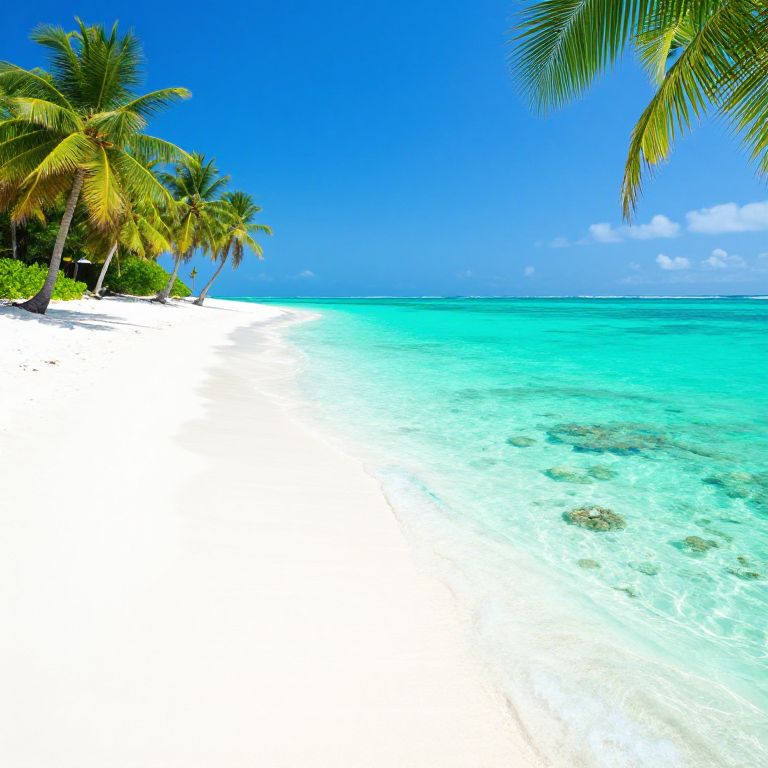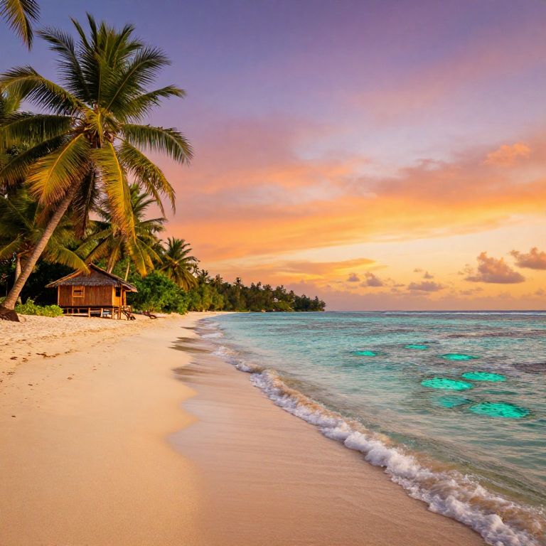 Patchwork small island, Mediterranean, deep blu water, nice white beach, in the background palm trees and a volcano, in the foreground a big heart standing on the beach 9:16,