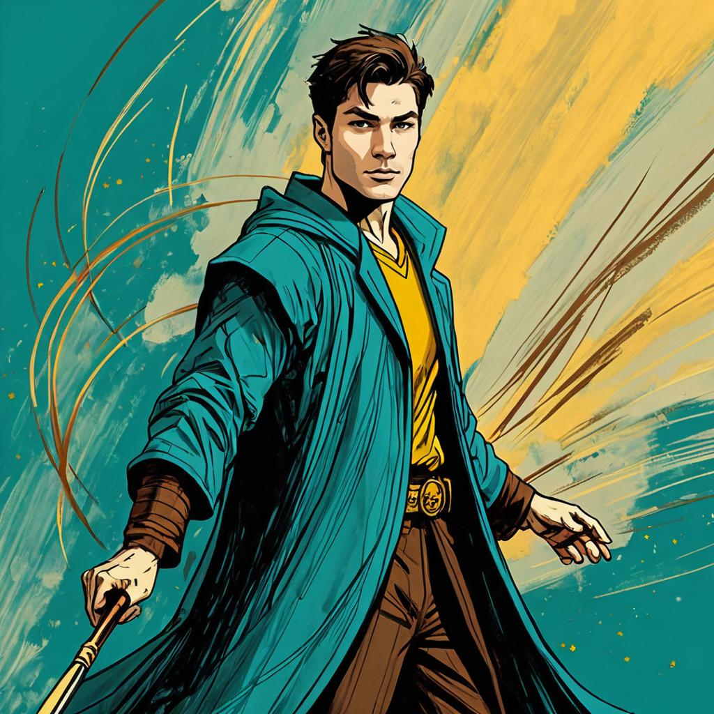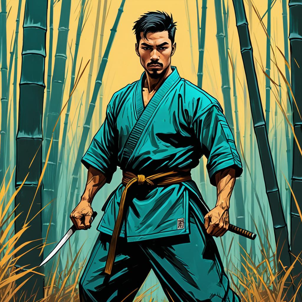 Illustration of a young muscular martial artist with close-cropped black hair and intense eyes standing confidently in an ancient, misty bamboo forest. He is dressed in a traditional blue gi with a yellow belt, holding a katana sword in each hand. The scene features dramatic cinematic lighting with a warm yellow background, emphasizing the warrior's strong and focused demeanor.