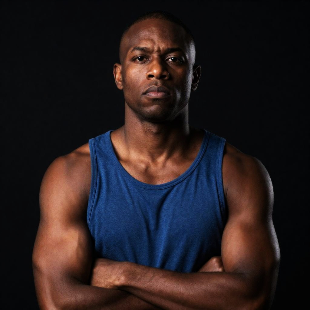 Photograph of a gym. Foreground: muscular black man with shaved head, wearing black t-shirt and red gloves, looking forward. Background: blurred black woman in white tank top, boxing bag with red and gray stripes, gym equipment.