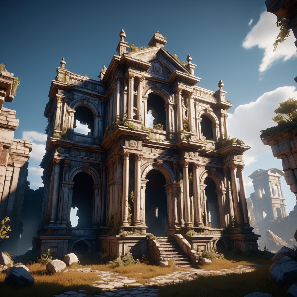 A freeform angle of an ancient ruin, crafted in a style inspired by Baroque, Rococo, and Bauhaus. Rendered in Unreal Engine 5, this highly detailed digital artwork features dramatic lighting and captures the essence of concept art, perfect for an artbook or wallpaper.