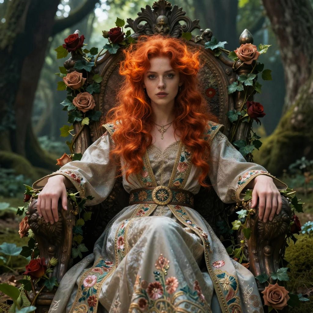 A photograph of a fair-skinned, red-haired woman with long, wavy hair wearing a floral crown and intricate, gold-accented dress. She's surrounded by glowing, ethereal deer-like creatures in a magical forest. Her dress has a sheer, flowing texture, and she's adorned with jewelry, including a blue gemstone necklace. Sunlight filters through the trees, creating a mystical, enchanting atmosphere.