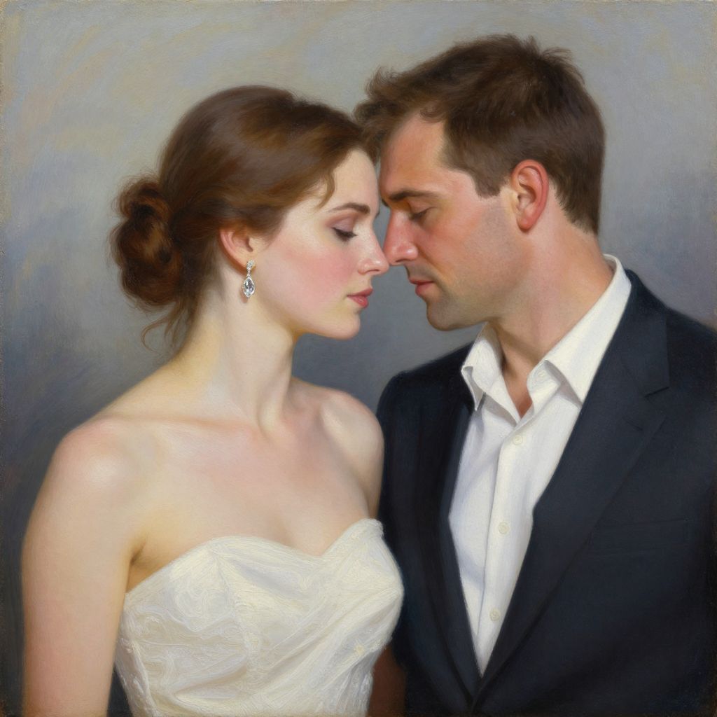 A digital painting depicting a bride and groom in a close, intimate pose against a muted gray background. The bride, with fair skin and brown hair in an elegant updo, wears a strapless white wedding gown and dangling silver earrings. She has a delicate, serene expression. The groom, with short brown hair and fair skin, dons a black tuxedo with a white shirt and black tie. They gaze into each other's eyes, their foreheads touching, exuding a sense of love and connection. The painting's realistic style emphasizes their soft features and romantic atmosphere.