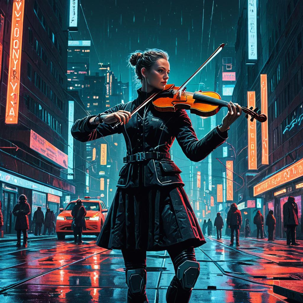A pixelated anime illustration of street musician playing violin at midnight, styled with neon noir vibes, featuring rain-soaked streets, glowing reflections, pixel-art aesthetic, vibrant colors, dramatic lighting