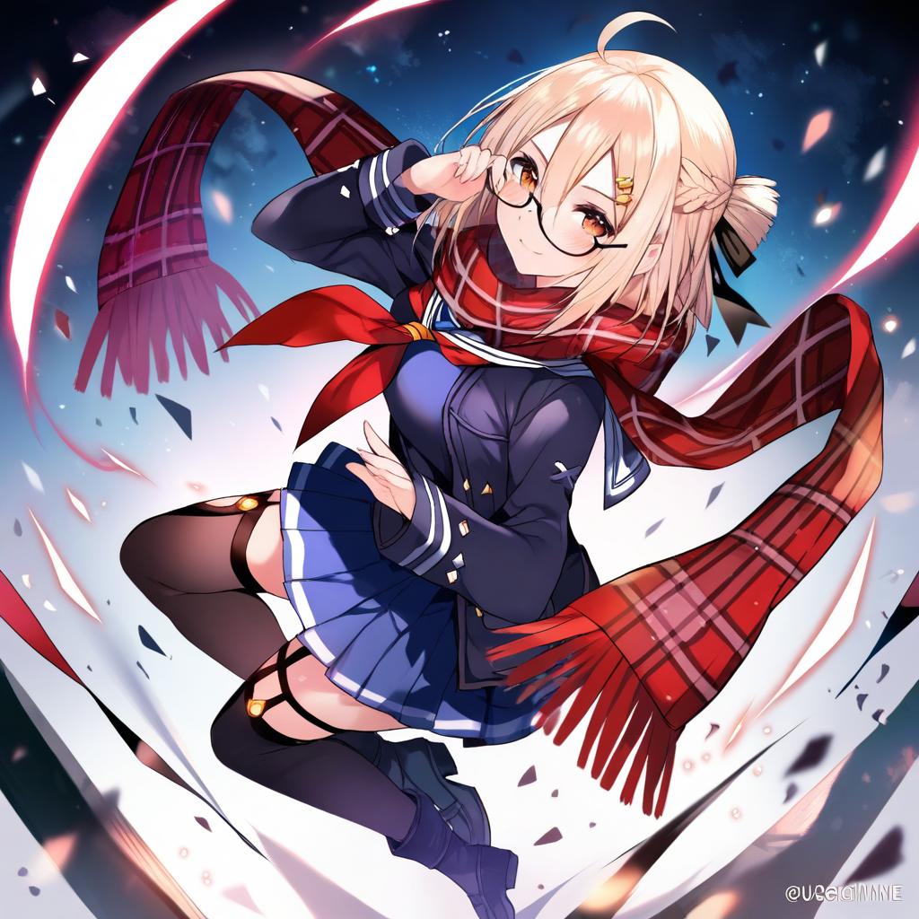 Mysterious heroine x alter (first ascension) (fate), fate (series), 1girl, yellow eyes, hair between eyes, glasses, black-framed eyewear, under-rim eyewear, blonde hair, short hair, ahoge, sidelocks, braid, french braid, serafuku, red scarf, plaid scarf, blue skirt, pleated skirt, black thighhighs, long sleeves, by artist usagihime, animagine