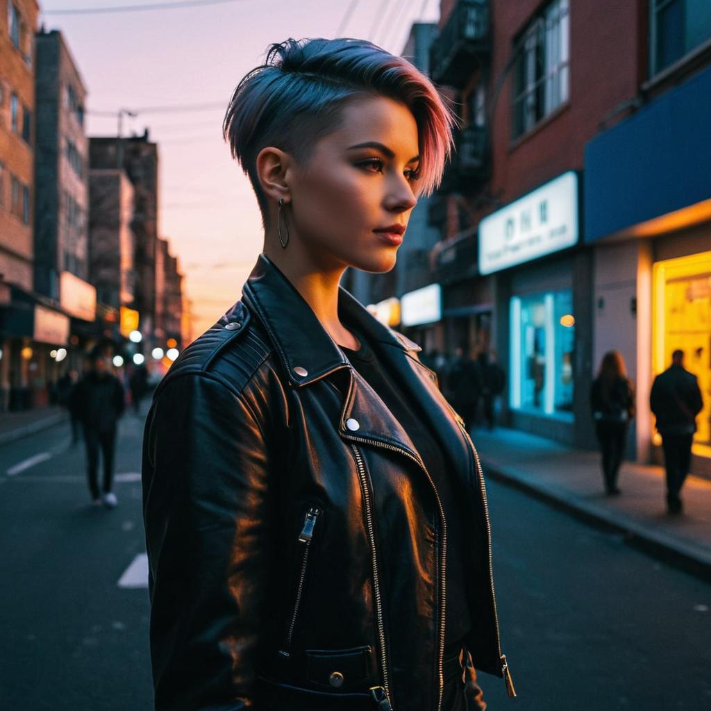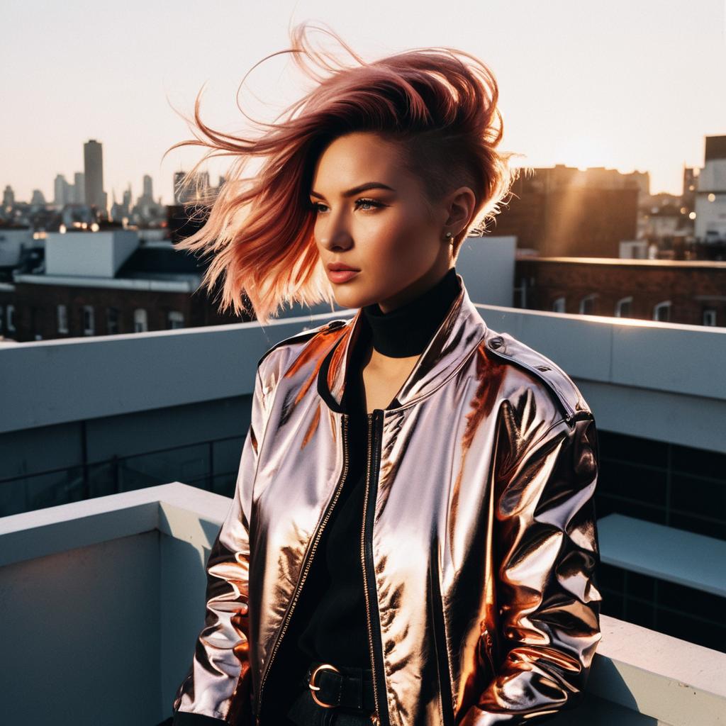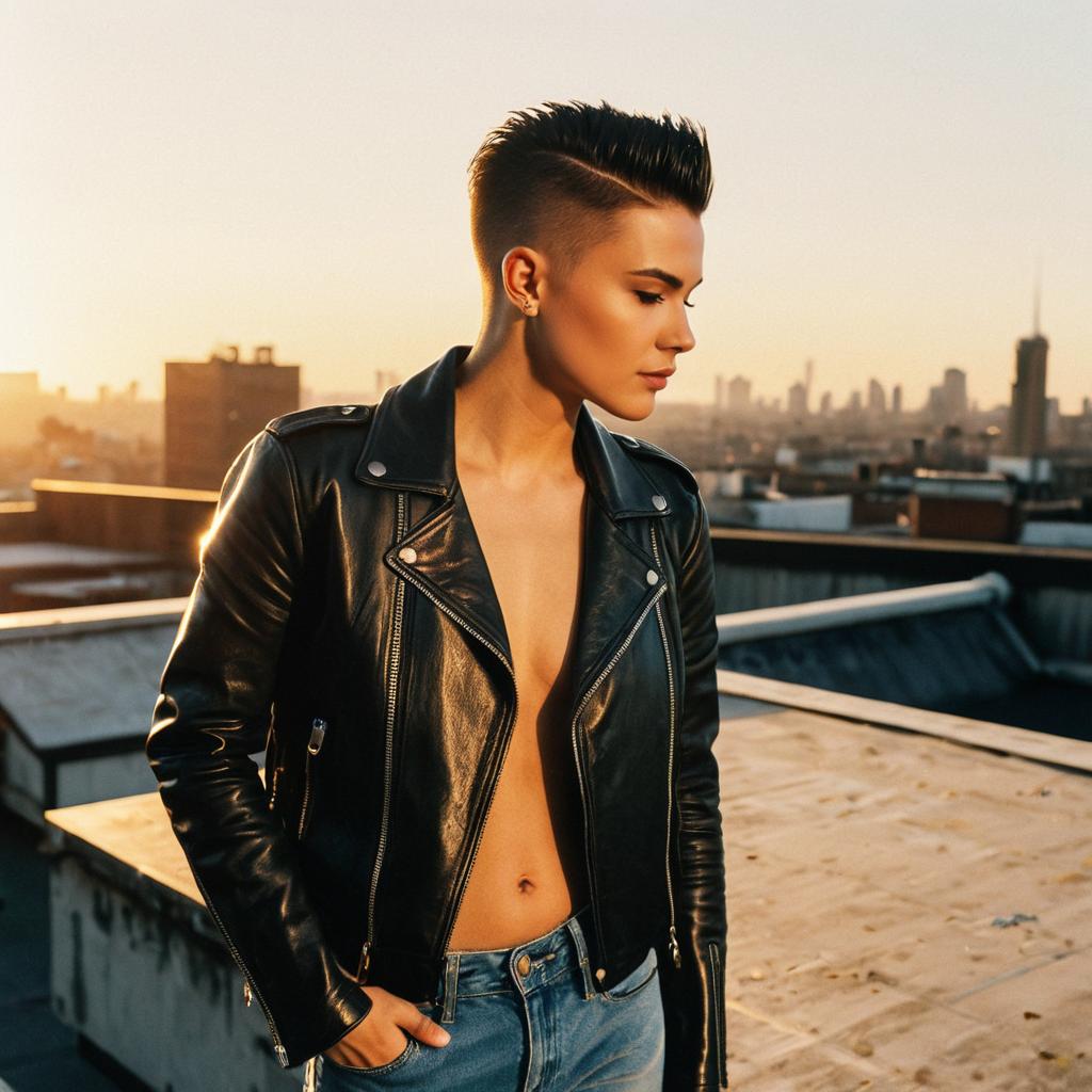 Undercut hairstyle on female model, wearing leather jacket, in urban rooftop, captured in fashion editorial style with soft morning light.