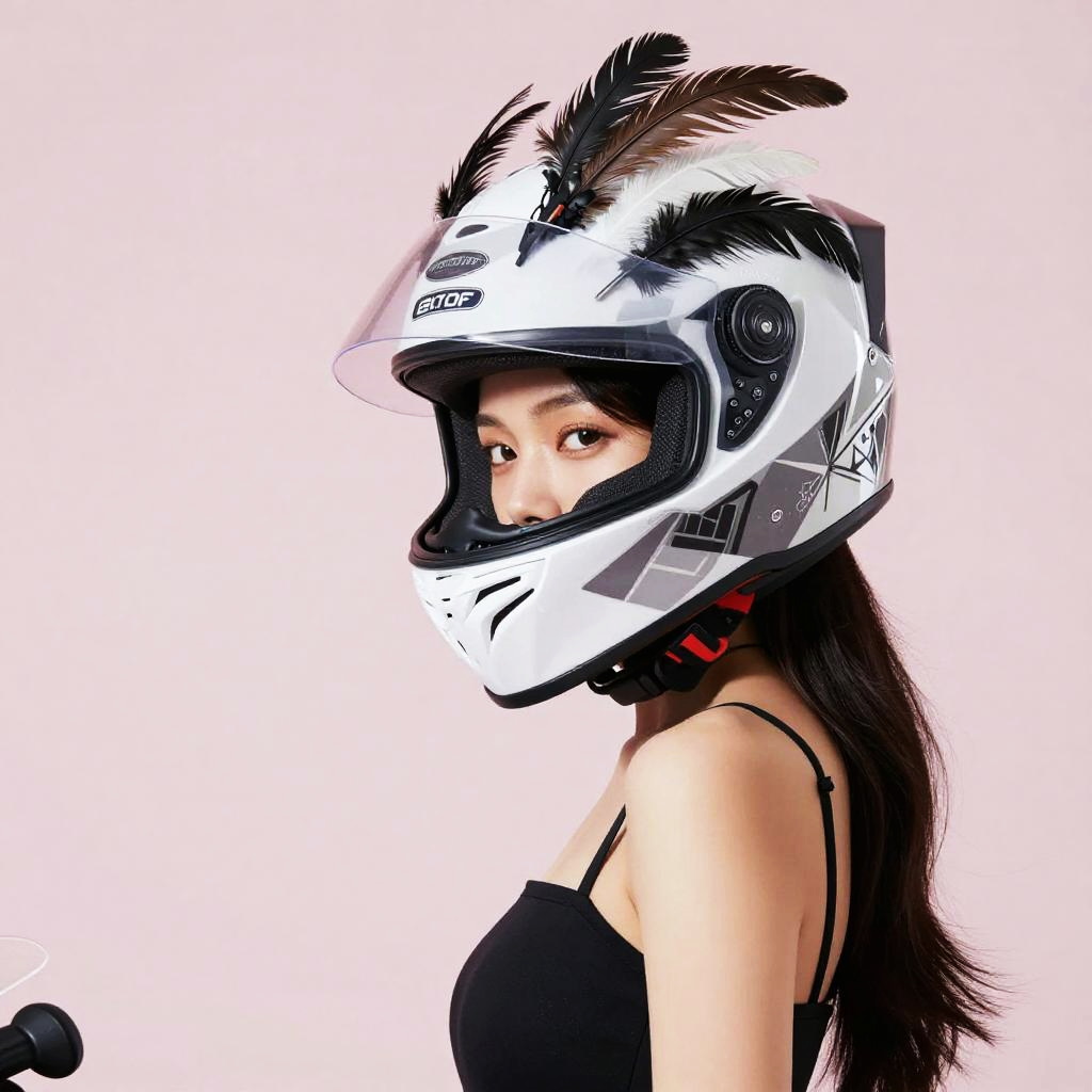 This striking image features a woman wearing a uniquely designed motorcycle helmet adorned with stylish feathers, evoking a blend of futuristic and artistic elements. The soft pastel background complements her elegant attire, showcasing a modern interpretation of motorcycle fashion.
