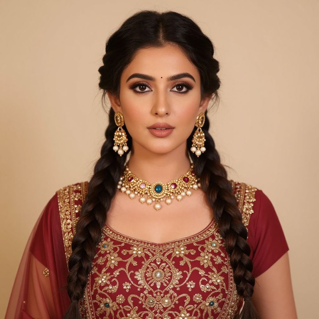 Woman diwali outfit costume, 1girl, solo, jewelry, earrings, necklace, black hair, long hair, realistic, braid, looking at viewer, makeup, upper body, single braid