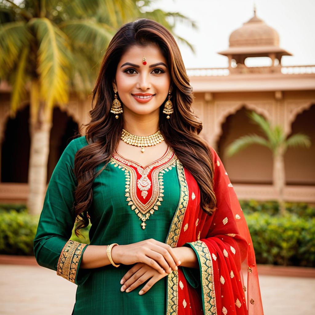 Indian Woman in Traditional Green and Red Salwar Kameez