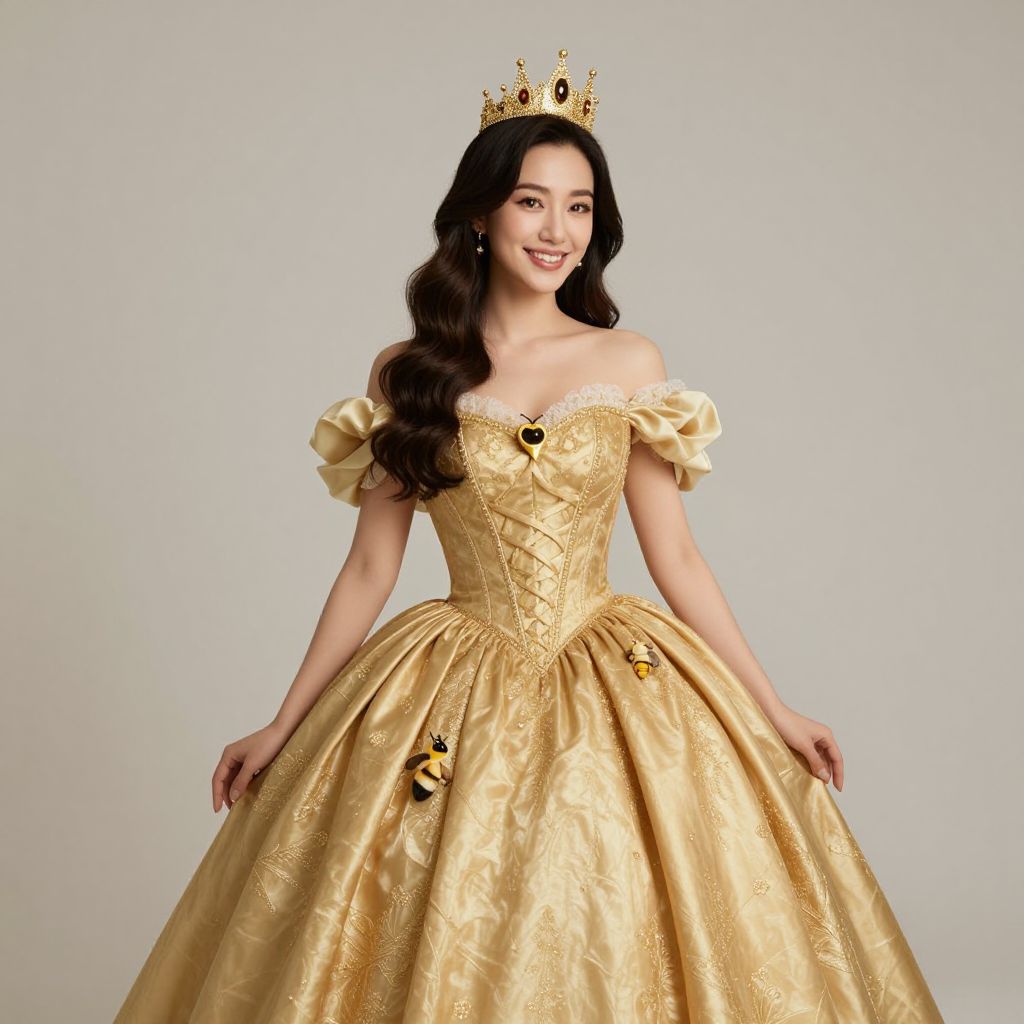 Asian princess in a golden, off-shoulder ball gown with puffed sleeves and intricate embroidery, wearing a jeweled crown, smiling against a plain