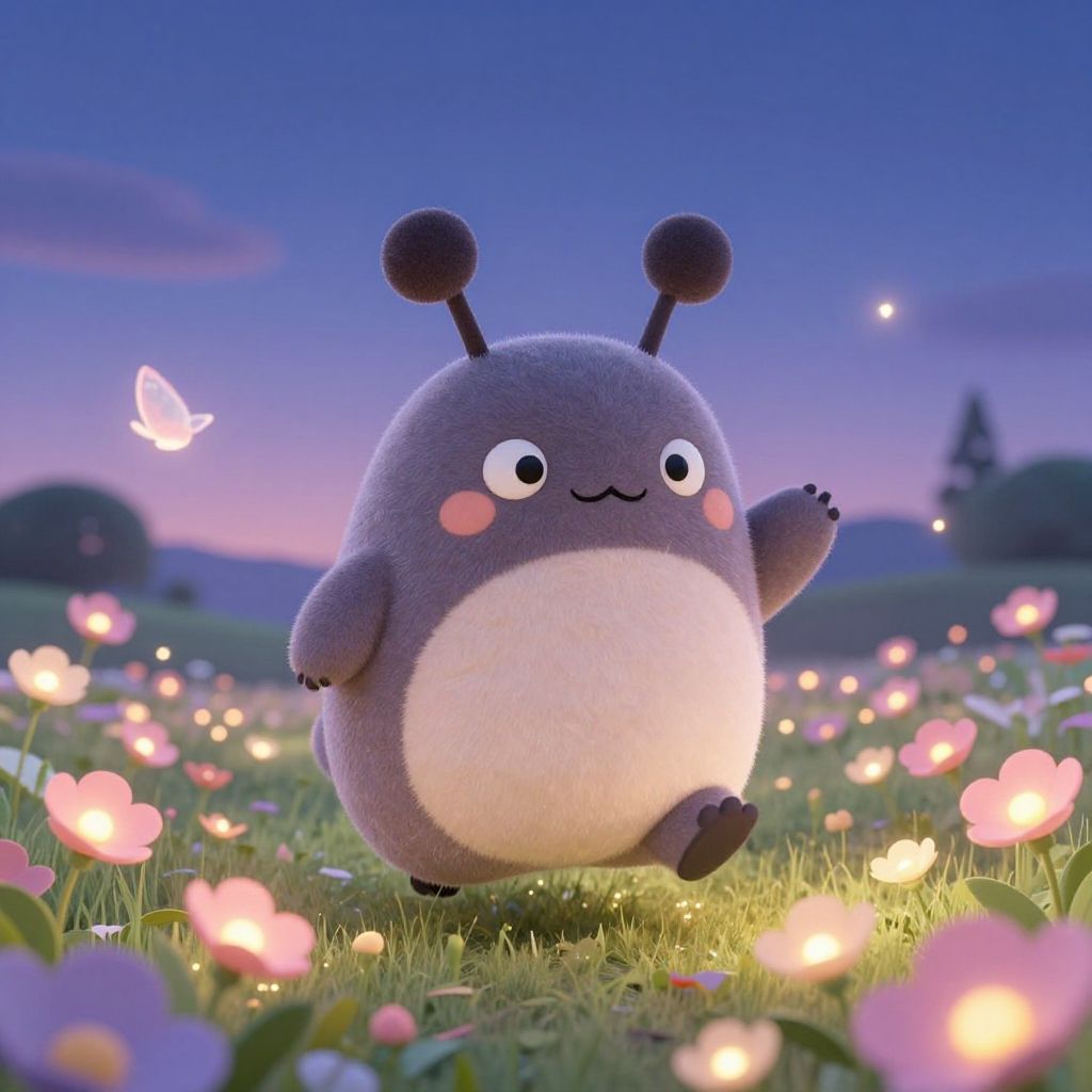 Photograph of a cute, round, purple and beige, fuzzy, cartoon-like creature with large, round ears and pink cheeks, standing in a grassy field at twilight. The creature has a smiling face with small, black eyes and a raised arm. Surrounding it are glowing, pink and white flowers scattered across the green grass. The background features a gradient sky from blue to purple with soft, blurred clouds. The scene is whimsical and serene, with a magical, dreamy atmosphere. The creature's texture appears soft and plush, contrasting with the smooth, glowing flowers.