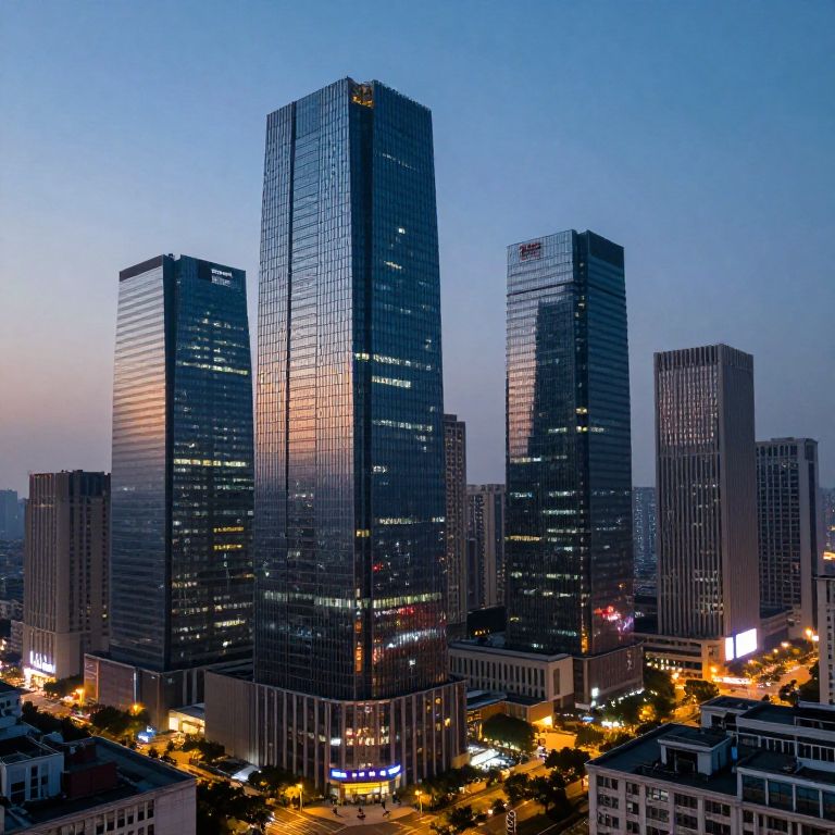 Semi realistic art style cityscape at dusk, towering skyscrapers with reflective glass, glowing street lights, subtle atmospheric haze, detailed textures on buildings, vibrant yet calm color scheme, cinematic composition