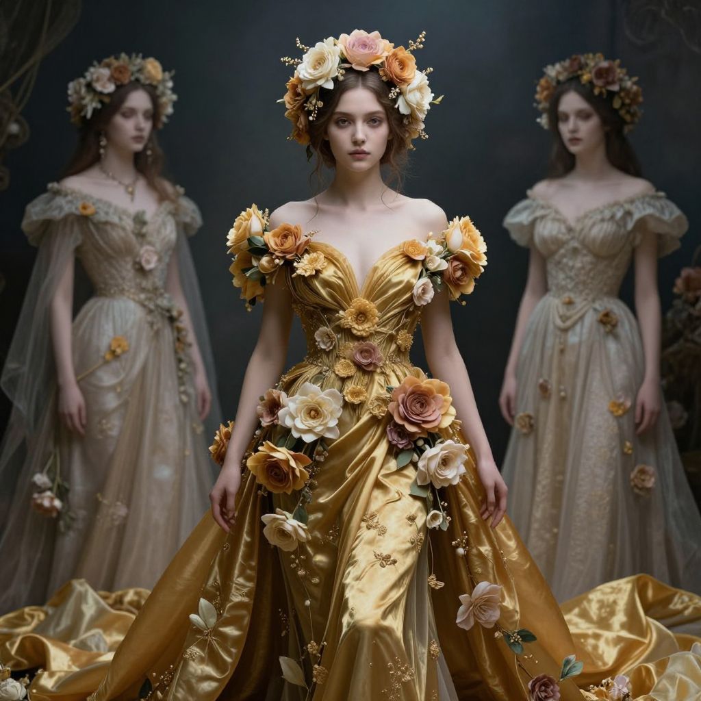 Photograph of three women in elaborate, floral-themed, Renaissance-inspired gowns. The central woman wears a golden, off-the-shoulder dress adorned with large, colorful flowers and a matching flower crown. Her dress features intricate embroidery and a fitted bodice. She stands confidently, hands by her sides. The two women in the background wear similar, cream-colored gowns with floral accents and flower crowns, standing in a slightly blurred, darkened background. The image has a soft, ethereal lighting, enhancing the luxurious fabric textures and floral details. The overall style is romantic and whimsical, with a focus on natural beauty and intricate design.