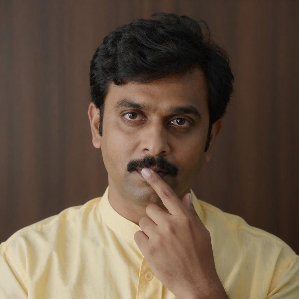 Middle-aged Indian man with dark hair, mustache, and glasses, peeks around wooden door. Wearing white shirt, serious expression. Background: green wall, wooden shelf with green bottle, white cloth above. Light green and warm yellow lighting. Photograph.