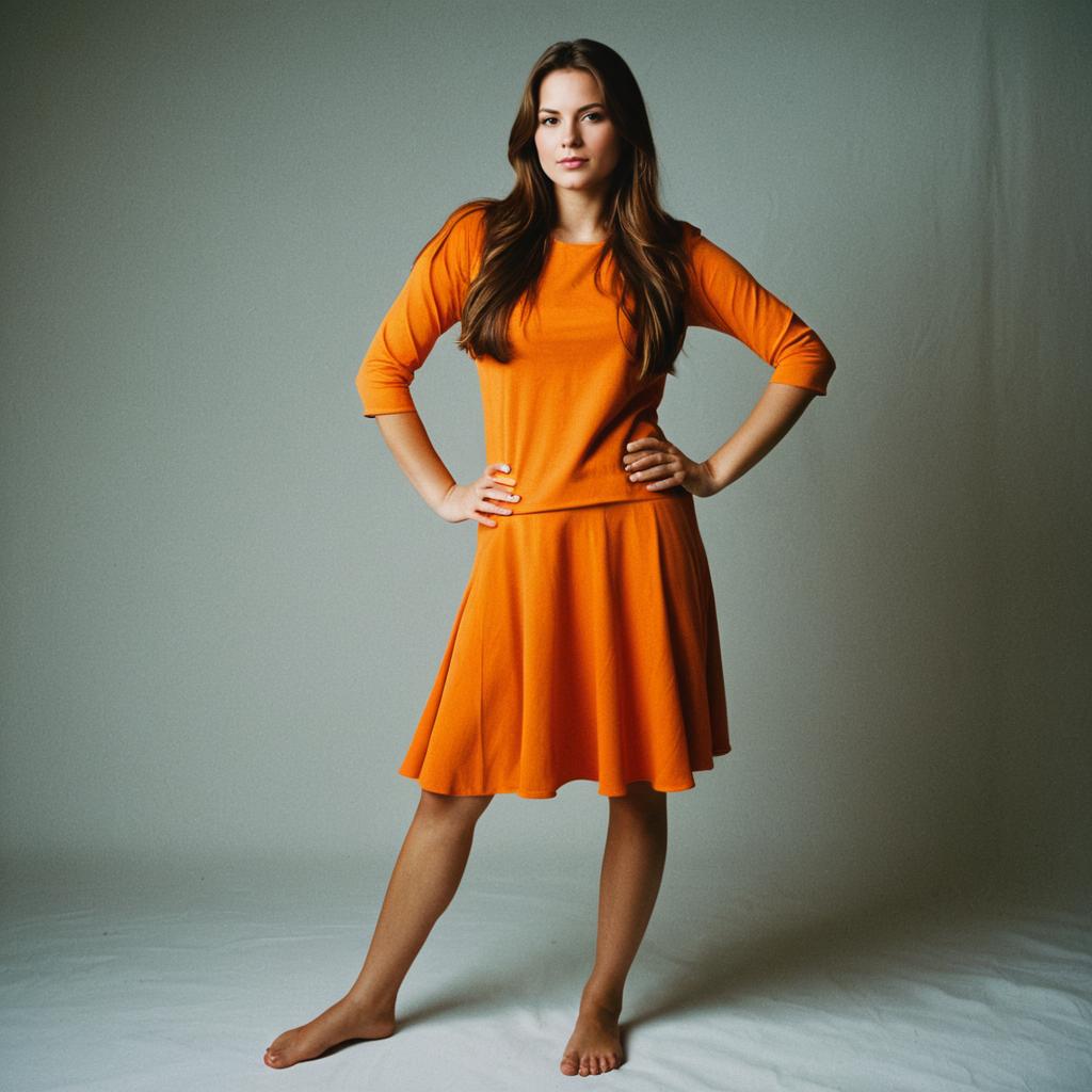 Outfit duvall,1girl, solo, dress, brown hair, realistic, standing, long hair, barefoot, photorealistic