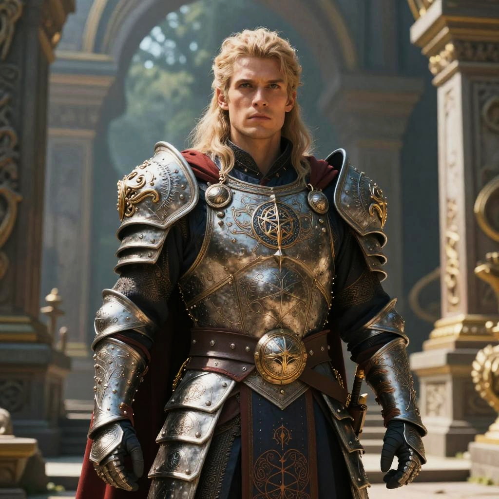Photorealistic CGI of a tall, blond man in elaborate, shiny medieval armor with intricate designs, standing in a sunlit, ancient stone courtyard.