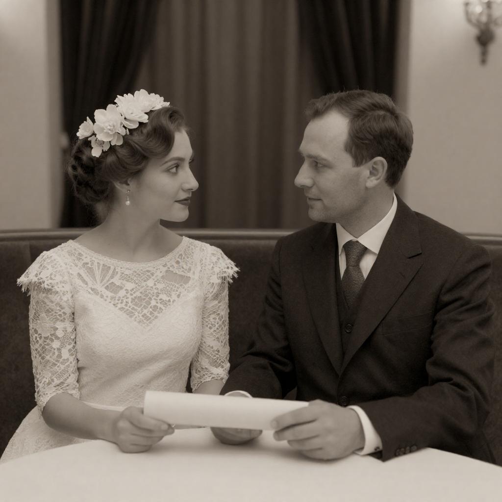 Sepia-toned photograph of a couple seated at a table. The man, in a dark suit with a tie, holds a rolled document, while the woman, in a white lace dress with a floral headpiece, looks at him. They are in an elegant room with a cushioned bench and dark curtains in the background.