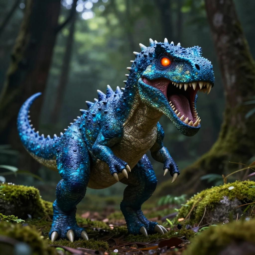 Photorealistic CGI image of a blue, scaly, dinosaur-like creature with glowing orange eyes and sharp, white teeth. Its body is covered in shimmering blue scales with white, spiked ridges along its back and tail. The creature stands on a moss-covered forest floor, surrounded by dense, dark green trees and blurred foliage in the background. The creature's mouth is open, as if roaring, and its claws are slightly extended. The lighting is dim, highlighting the creature's vibrant colors and textures against the darker forest setting. The style mimics high-detail digital art often seen in fantasy or sci-fi genres.