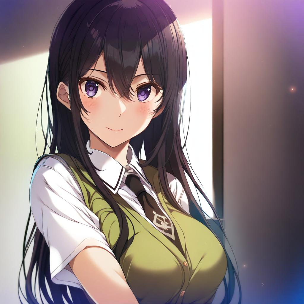 Aihara mei, citrus (saburouta), 1girl, lips, purple eyes, long hair, black hair, medium breasts, school uniform, aihara academy school uniform, by artist tenchisouha, illustrious