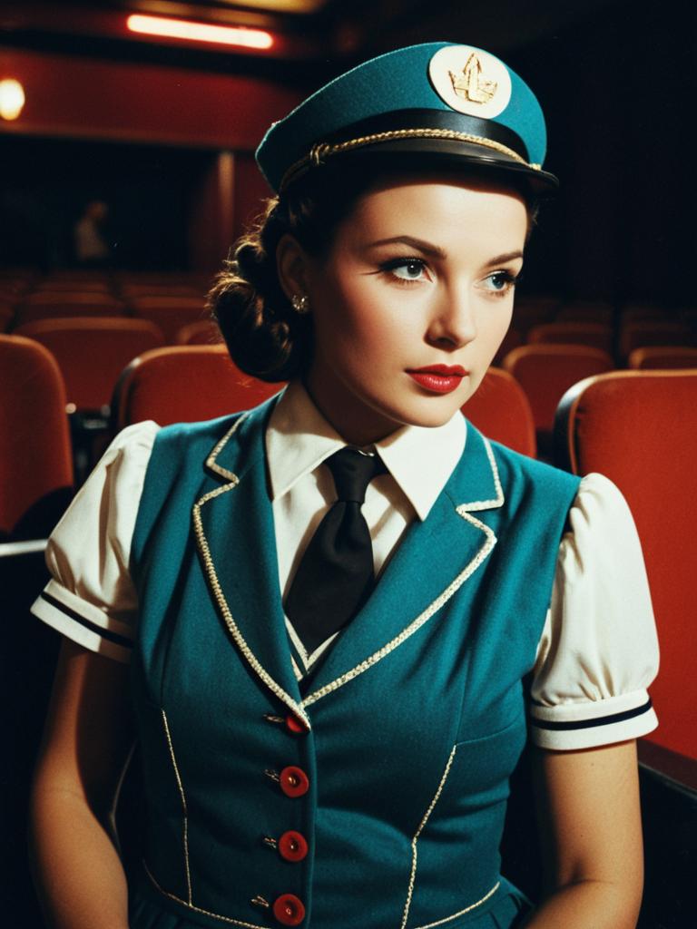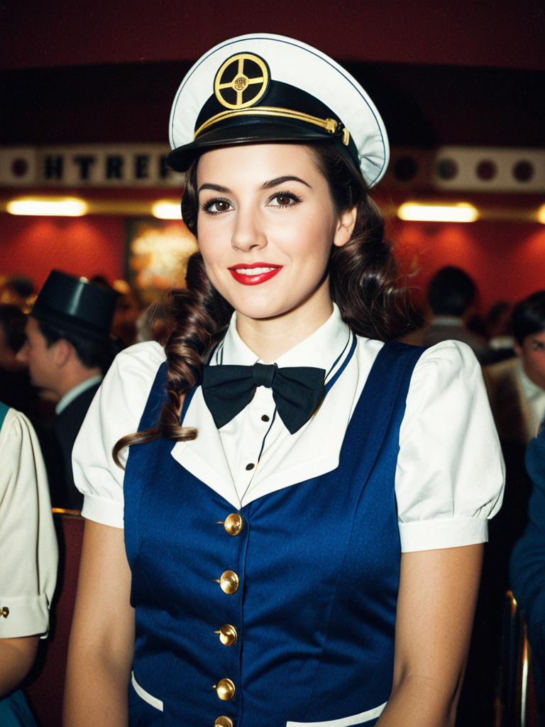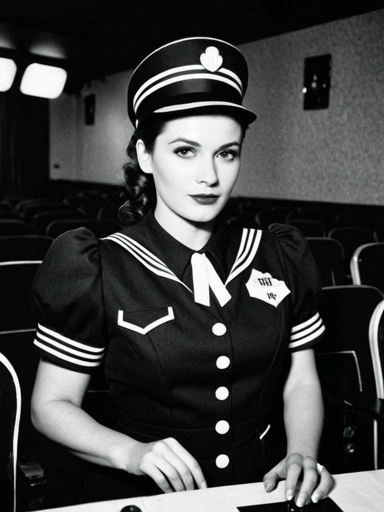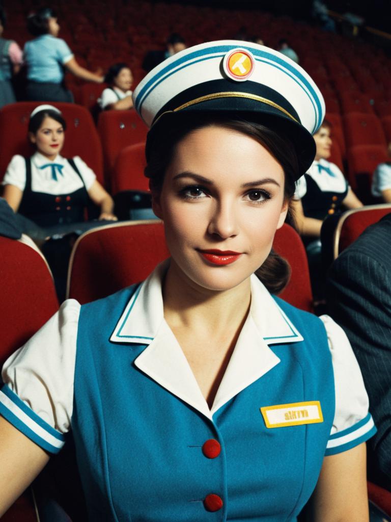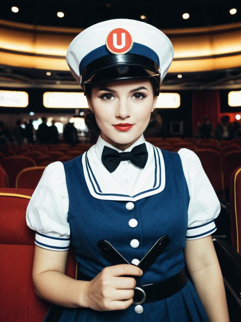 Photorealistic image of a young woman wearing a blue and white cinema usherette costume with gold buttons and a matching cap standing in a theater with red seats and dim lights. The woman has fair skin, dark hair styled in curls, and wears a white blouse with puffed sleeves and a black bow tie under the dress. The setting appears to be a classic movie theater or a cosplay event.