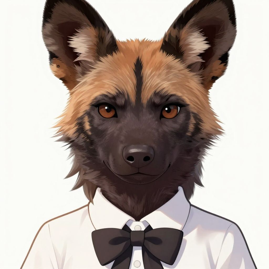 Digital illustration of an anthropomorphic African wild dog with brown and black fur, wearing a white shirt and black bow tie, centered against a white background.