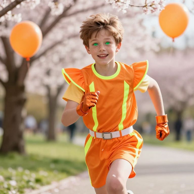 A playful, athletic teenager with freckles, light brown skin, and bright green eyes, dressed in a dynamic orange themed fancy dress with neon accents, bold shoulder pads, and metallic orange gloves, jogging through a sunny park in the afternoon with cherry blossoms and orange-colored balloons floating in the air.